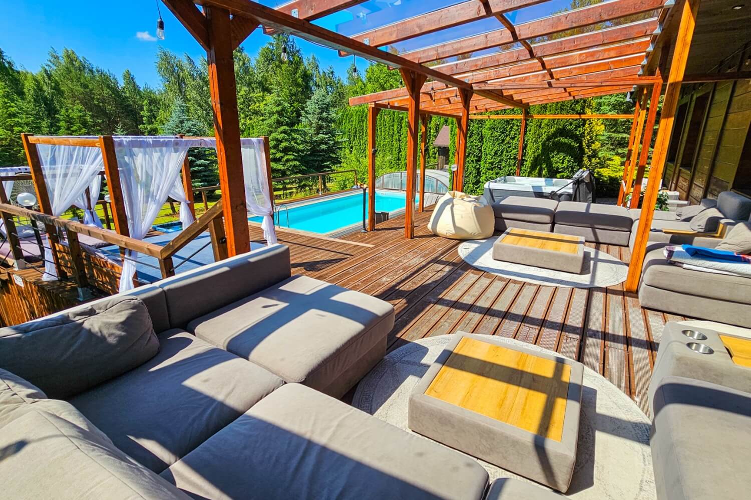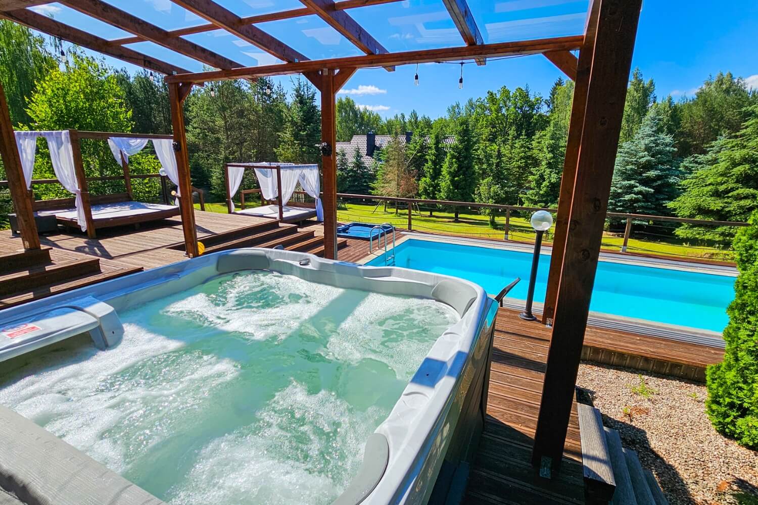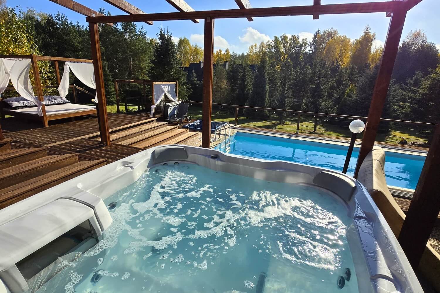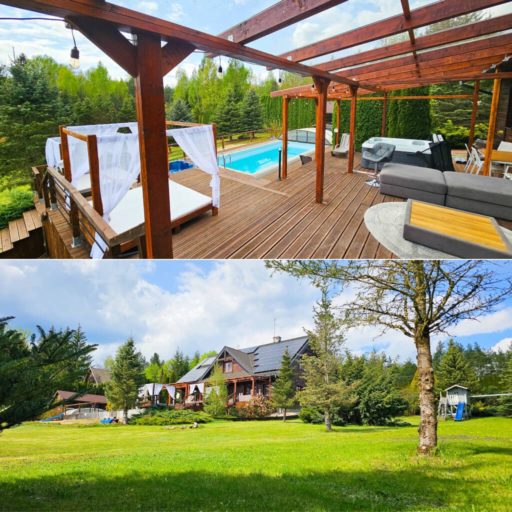Na Gości czekają także: podgrzewany basen (w sezonie letnim), Jacuzzi®, sauna, fotel masujący, kominek, projektor 4K, PS5, stół do pokera, bilard, dart i mnóstwo innych atrakcji.