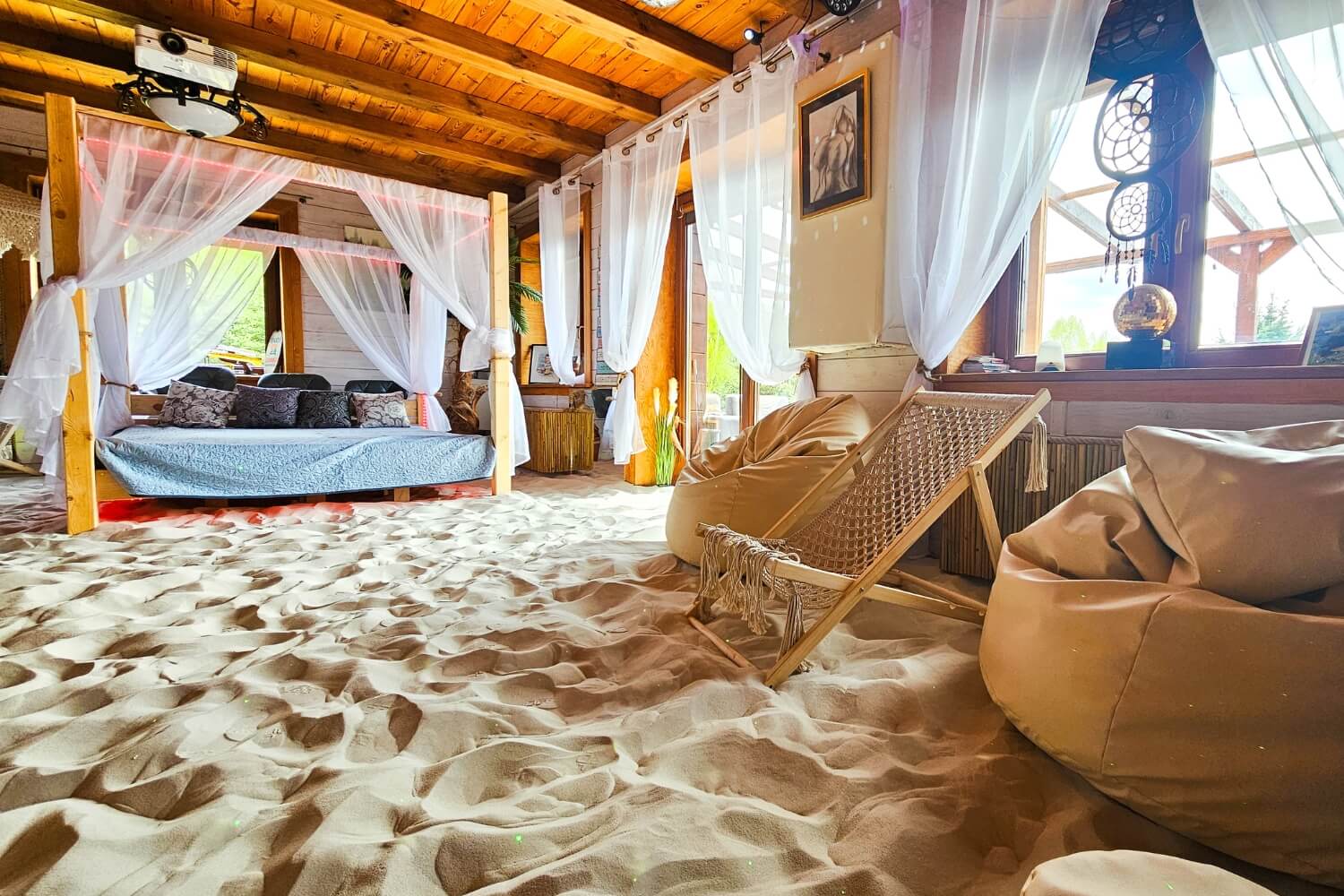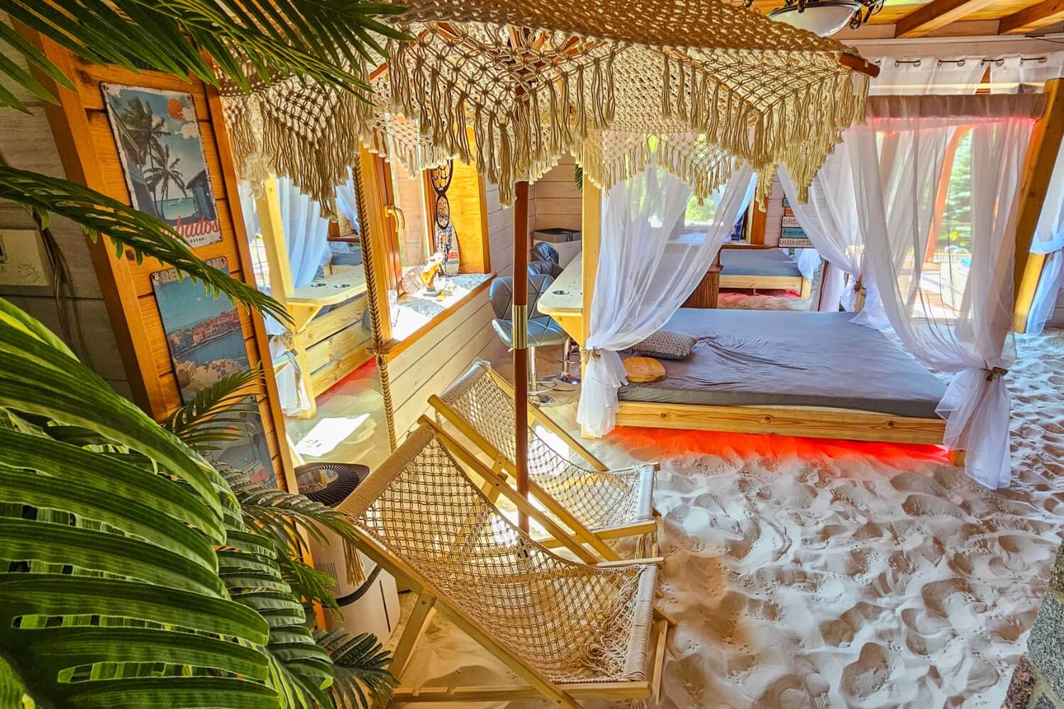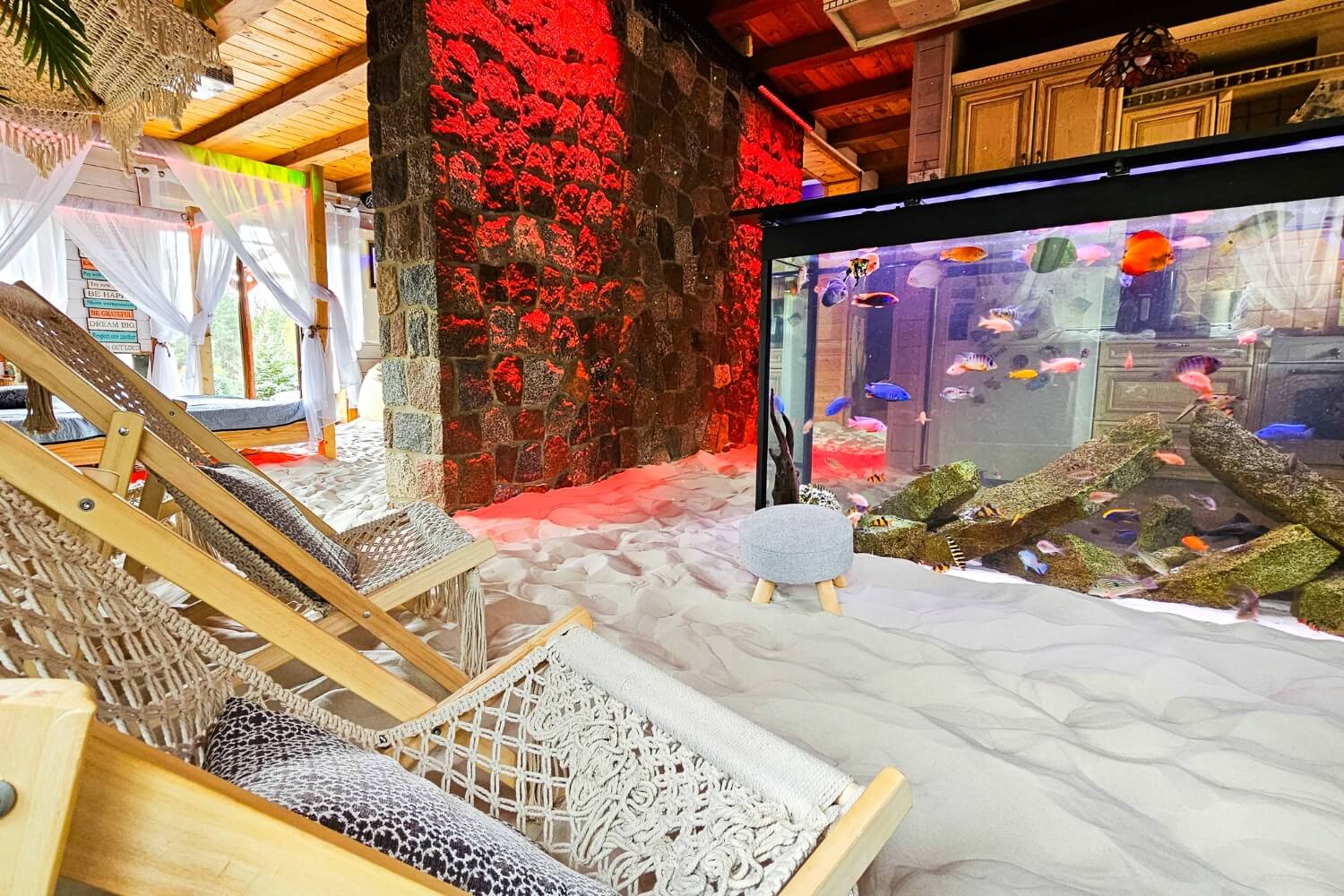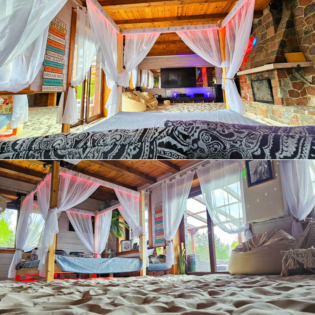 Willa z Basenem – Beach House to wyjątkowe miejsce, w którym przenosisz się w tropiki… bez paszportu. Wchodzisz do salonu, a tam: prawdziwe palmy, łóżko balijskie, leżaki, potężne akwarium i ciepły, podgrzewany piasek pod stopami. Zamykasz oczy i czujesz się jak na egzotycznych wakacjach.