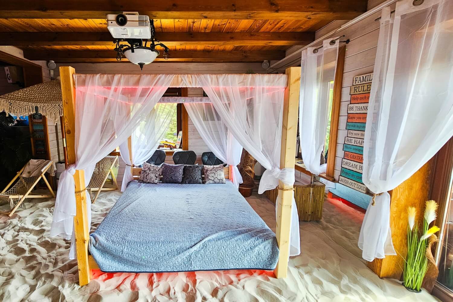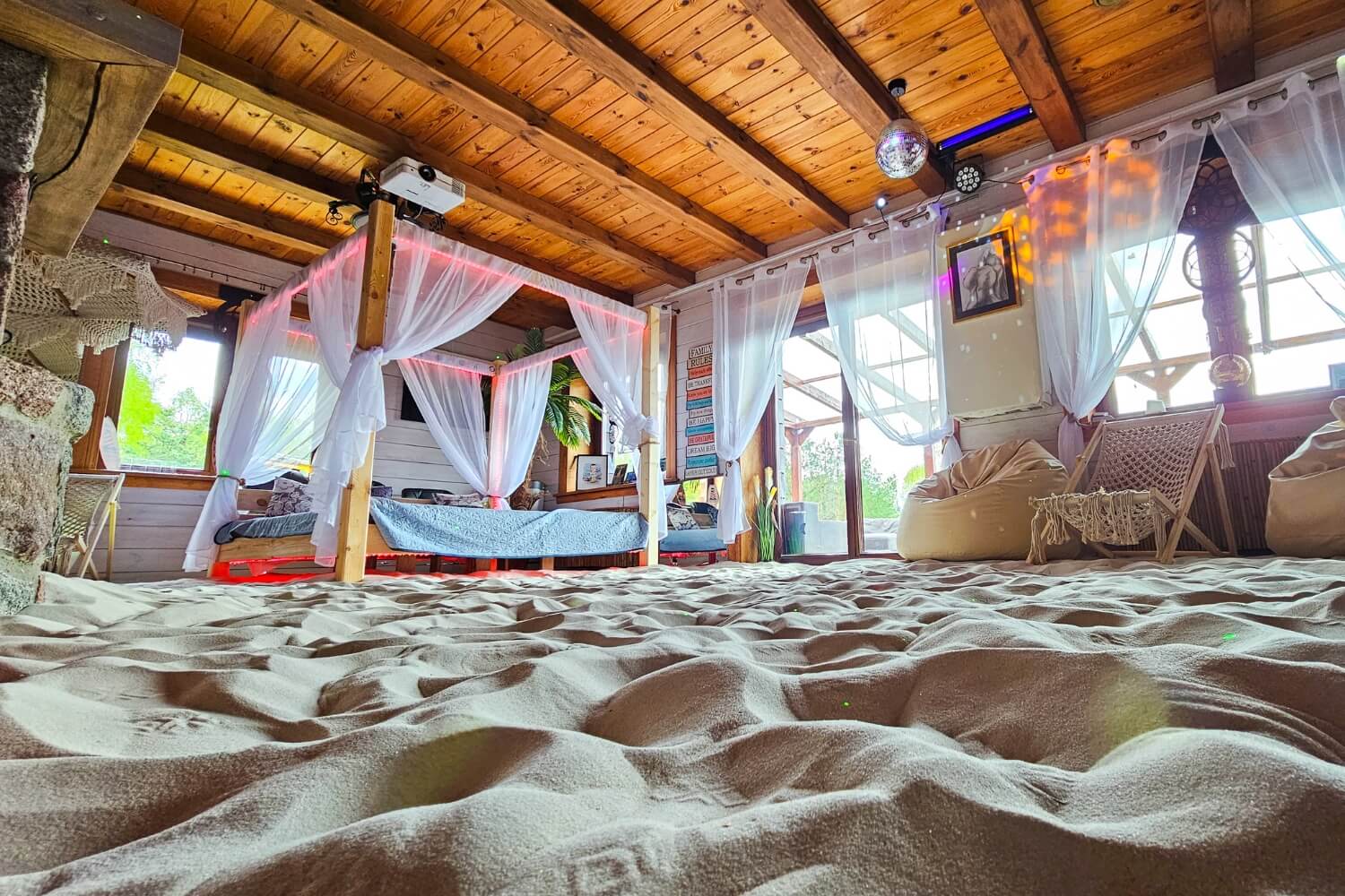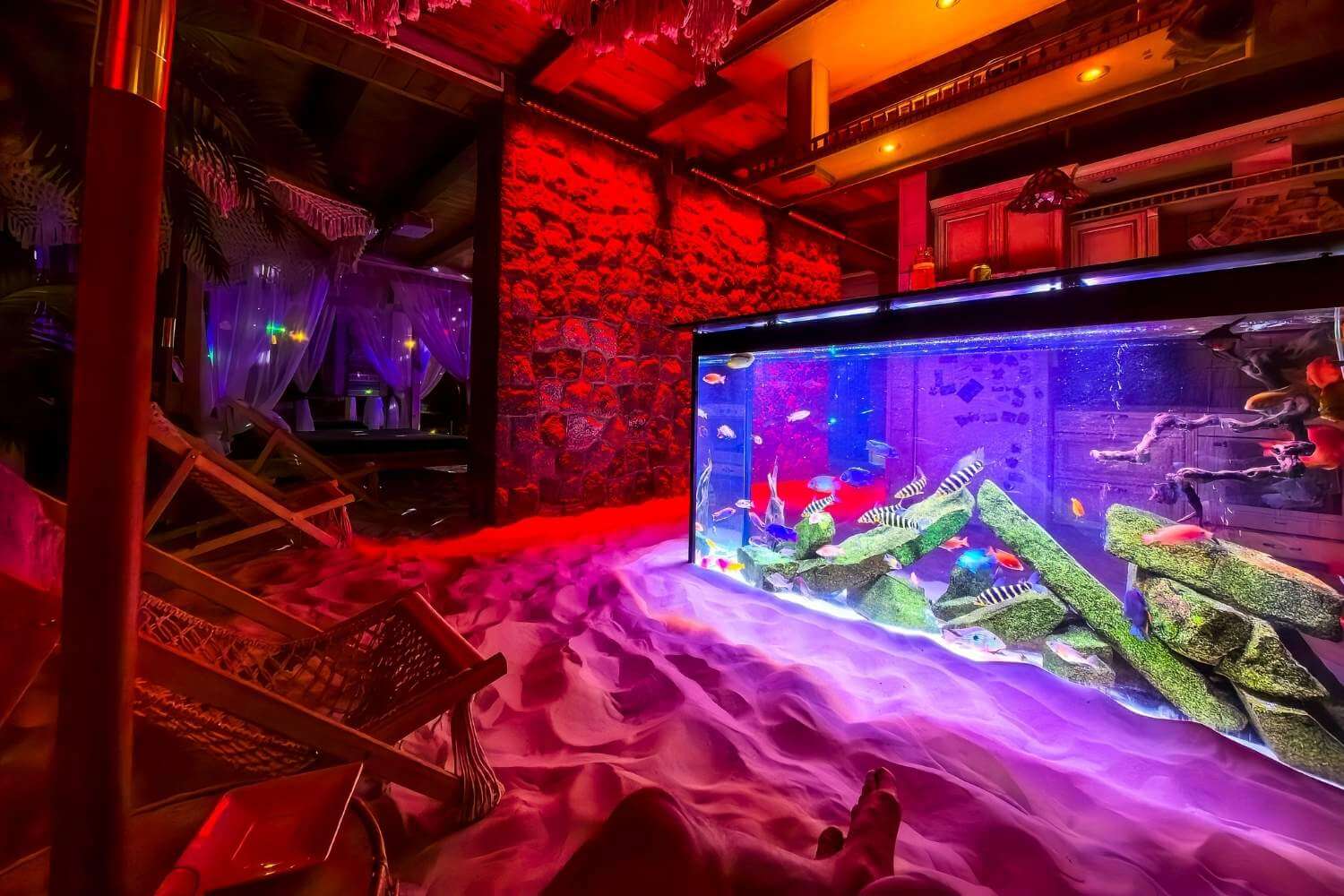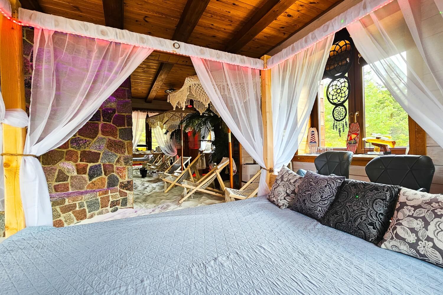 Willa z Basenem – Beach House to wyjątkowe miejsce, w którym przenosisz się w tropiki… bez paszportu. Wchodzisz do salonu, a tam: prawdziwe palmy, łóżko balijskie, leżaki, potężne akwarium i ciepły, podgrzewany piasek pod stopami. Zamykasz oczy i czujesz się jak na egzotycznych wakacjach.
