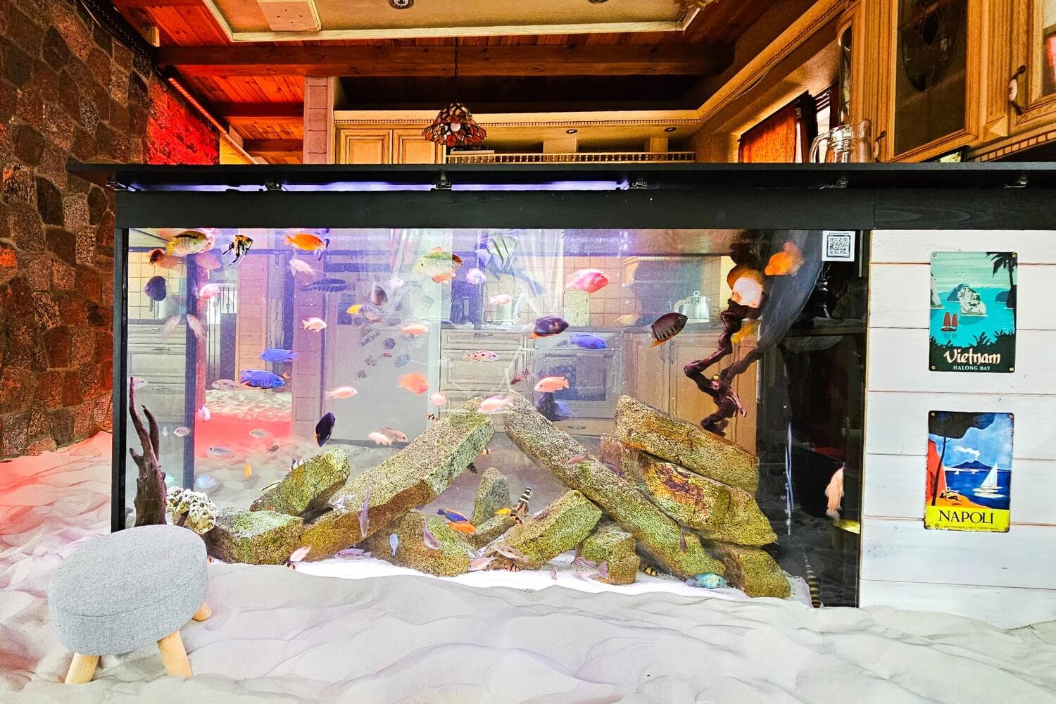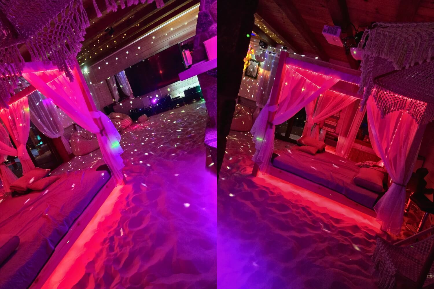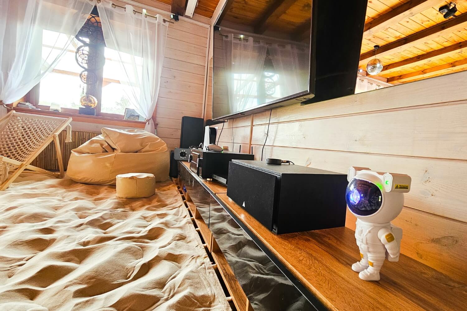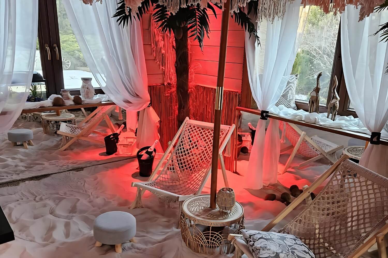 Willa z Basenem – Beach House to wyjątkowe miejsce, w którym przenosisz się w tropiki… bez paszportu. Wchodzisz do salonu, a tam: prawdziwe palmy, łóżko balijskie, leżaki, potężne akwarium i ciepły, podgrzewany piasek pod stopami. Zamykasz oczy i czujesz się jak na egzotycznych wakacjach.